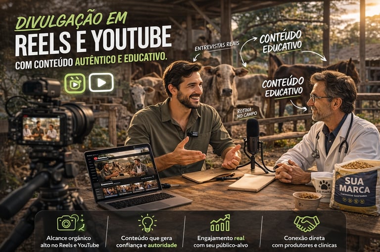 Divulgação em reels e YouTube com conteúdo autêntico e educativo.